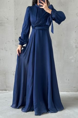 Kol Bağlama Detaylı Akıcı Kumaş Tesettür Abiye Lacivert