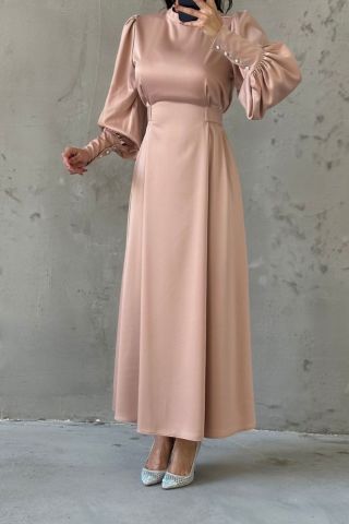 Balon Kol İnci Detaylı Saten Tesettür Abiye Pudra