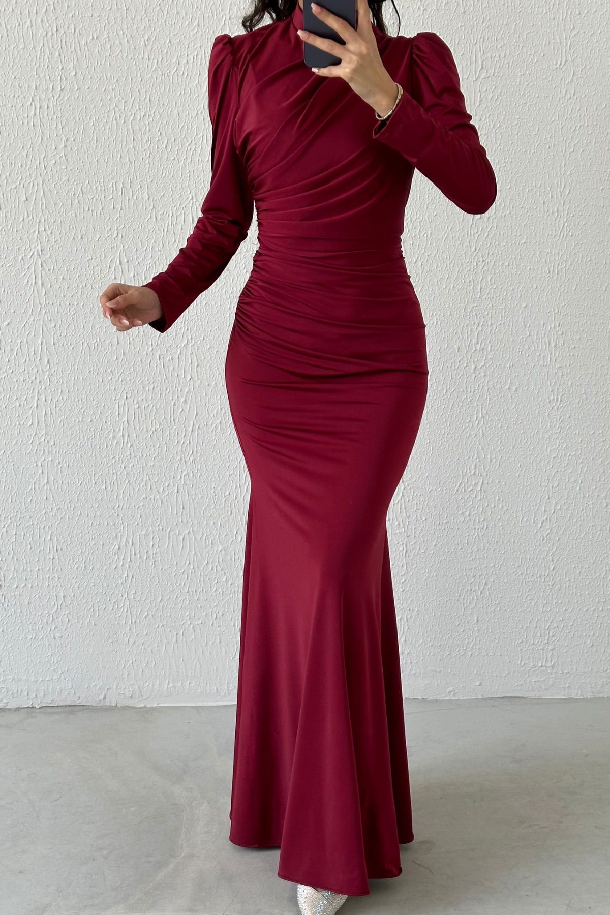 Basic Fish Model Sendi Fabric Hijab Evening Dress Claret Red
