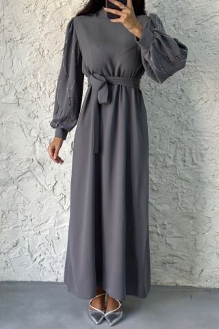 Kolları Boydan İşlemeli Krep Tesettür Abiye Gri