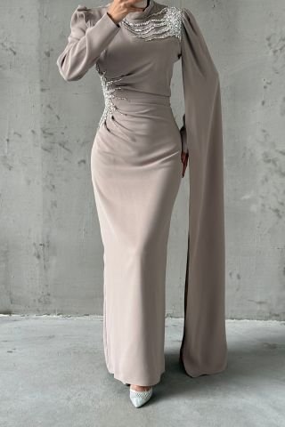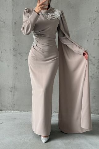 Omuzdan Ve Belden Taşlı Krep Tesettür Abiye Taş