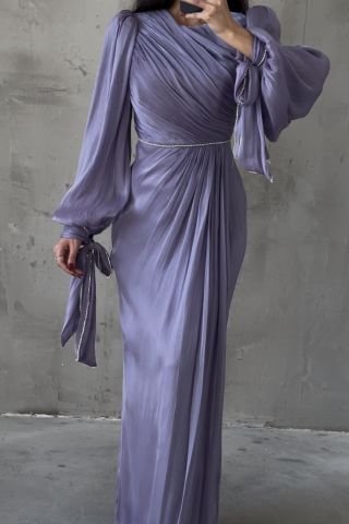 This evening dress, where nobility and elegance meet, makes a difference with its draped design and pearl details. The bow detail on the sleeve cuffs adds a romantic atmosphere. A model that will dazzle Leyuze Girls at special invitations, offering comfort with its fluid fabric. Our model is wearing the smallest size.