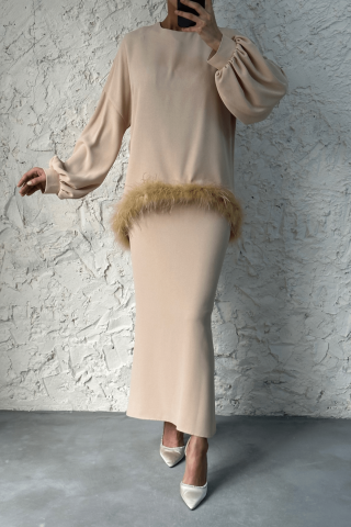 Tüy Detaylı Etekli Tesettür Takım Taş Rengi