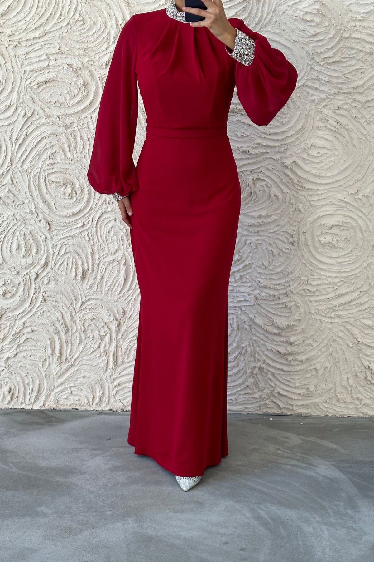 Simple and Stylish Balloon Sleeve Stone Detailed Crepe Evening Dress Burgundy