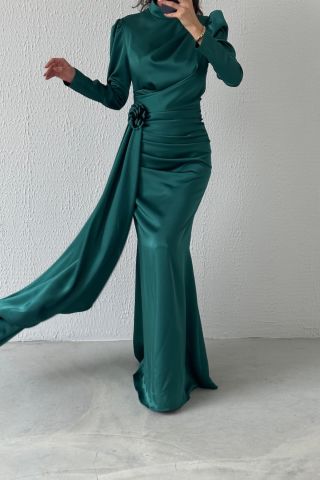 Satin Hijab Evening Dress Emerald Green with Stylish Waist Detail