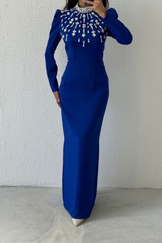 Shining Elegance: Stone Detailed Satin Hijab Evening Dress Saks Blue