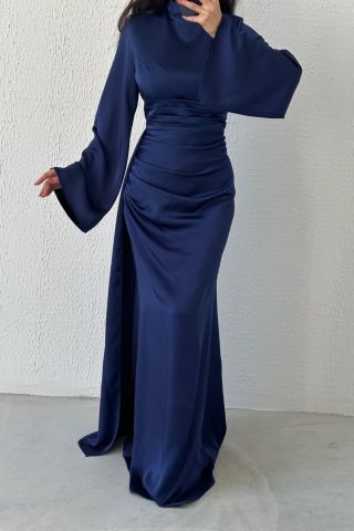 Kuyruk Detaylı Saten Tesettür Abiye Lacivert