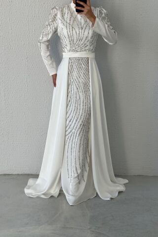 Boydan Taş İşlemeli Pelerinli Saten Tesettür Abiye Ekru