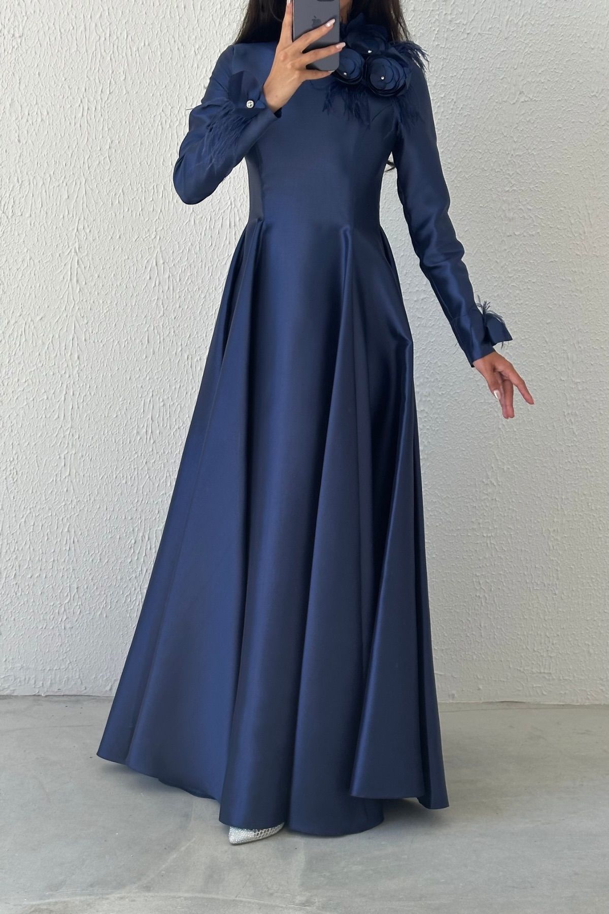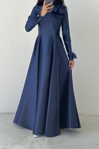 Broş Detaylı Asil Saten Tesettür Abiye Lacivert