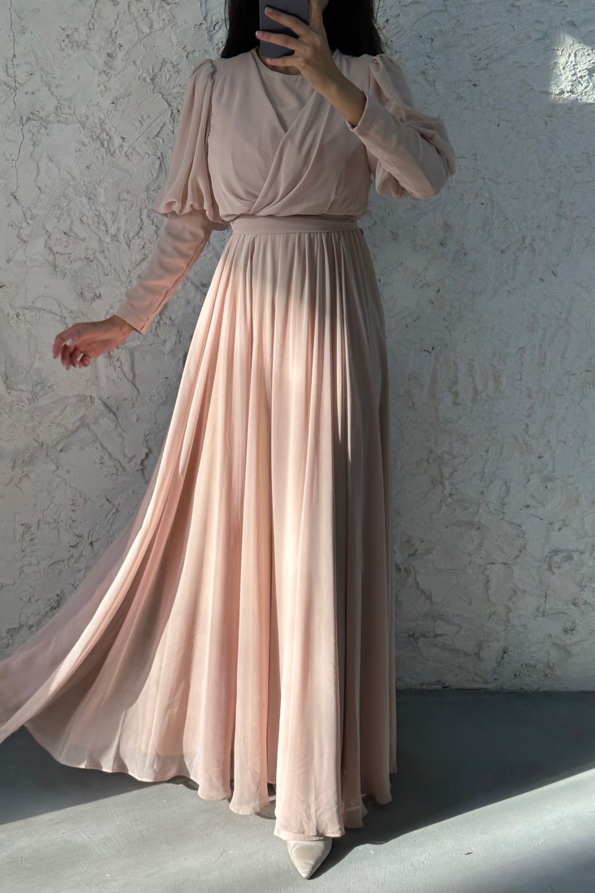 İnce Kuşaklı Şifon Tesettür Abiye Taş