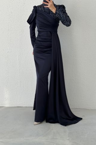 Şık Tasarımıyla Göz Kamaştıran Saten Tesettür Abiye Lacivert